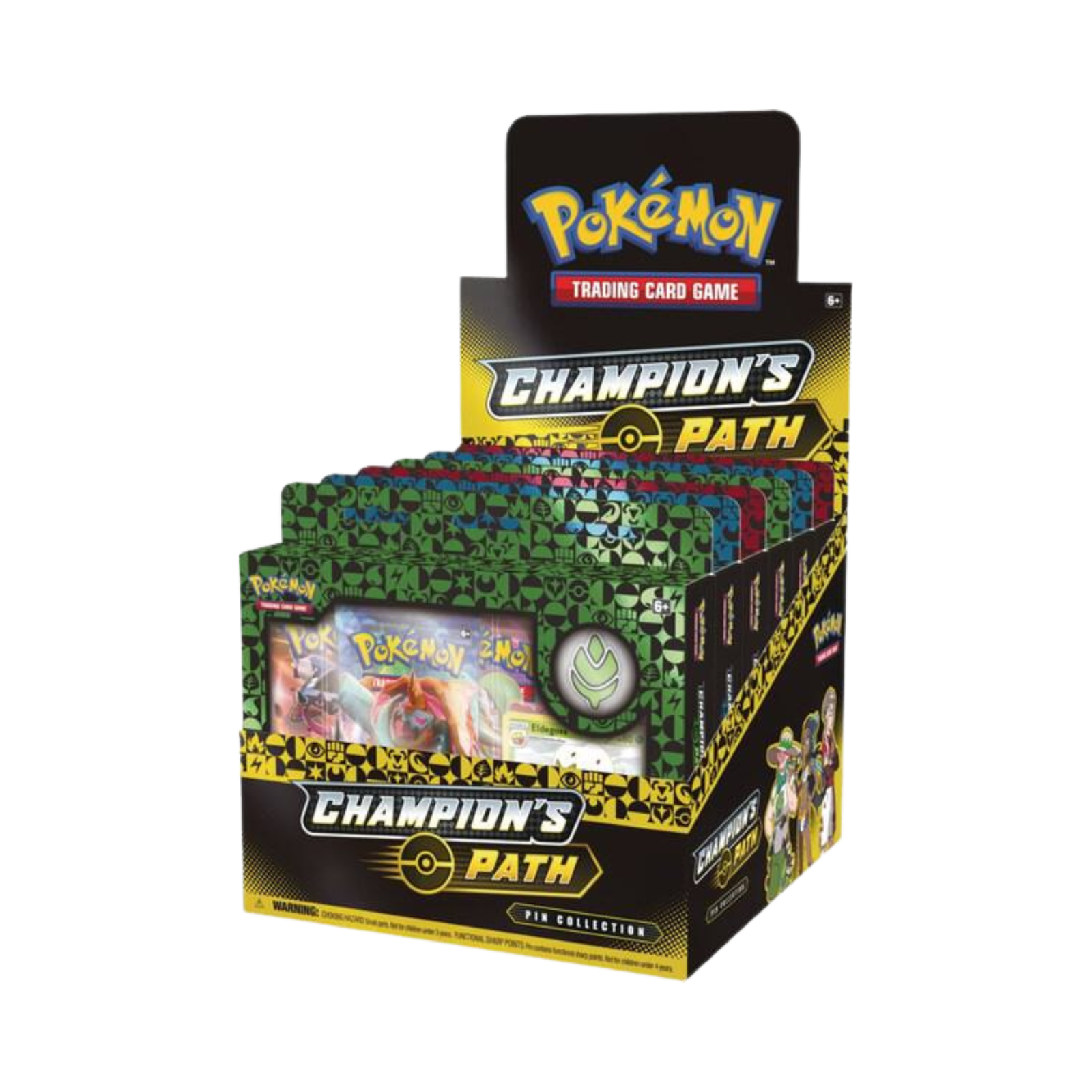 The Pokémon TCG: Champion’s Path Pin Collection Display features 6 sealed boxes themed after the first three Gyms in the Galar region—Turffield, Hulbury, and Motostoke. Each Pin Collection highlights a Gym Leader’s partner Pokémon, includes a Gym badge-style pin, and contains 3 Champion’s Path booster packs.